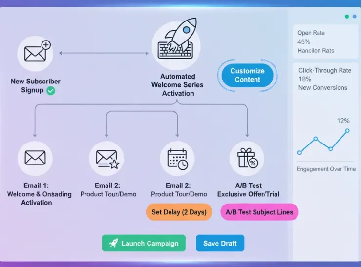 Connect your signup or event trigger (form, webhook, CRM) to an email automation tool, then build and schedule the campaign flow (welcome, follow-ups, branching) so emails go out automatically based on behavior.